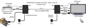 The HDMI/RS232 Extender Kit with ARC, HDBT, UHD-4K (500458-ARC) allows HDMI equipment to be connected up to 131ft (40m) at 4K/30 (4:4:4) and 4K/60 (4:2:0) resolution, or 230ft (70m) at resolutions up to 1080p via one (1) Cat 5e/6 unshielded twisted pair cable in a point-to-point configuration. The kit supports Audio Return Channel (ARC), allowing the Receiver to return audio from a sink device such as a smart TV back to the Transmitter and on to an audio system. The originating ARC signal may be received via the HDMI or TosLink-in port of the 500458-ARC-RX and transmitted via the TosLink-out port of the 500458-ARC-TX. The unit is HDCP 2.2 compliant and supports RS232 and bidirectional IR pass through transmission for end device remote control. The kit includes one (1) transmitter, one (1) receiver, one (1) IR Emitter, one (1) IR sensor, and two (2) power supplies.