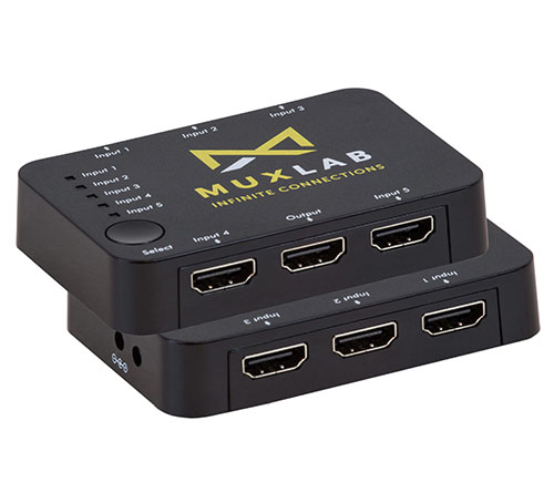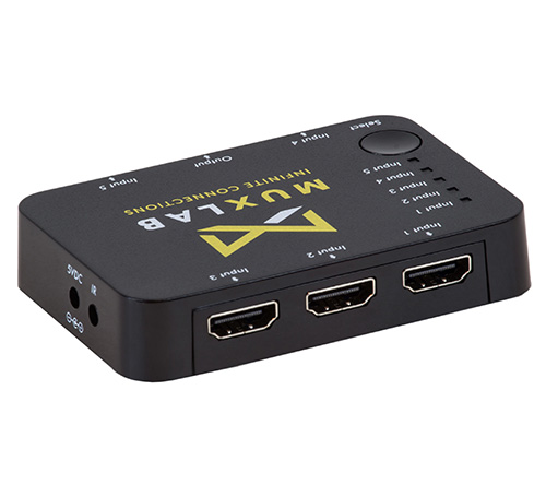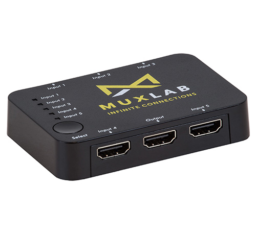 The HDMI 5×1 Switcher 4K/60 (Model 100526) allows one of five HDMI sources to be switched to one HDMI display. The switcher supports resolutions up to 4K (3840 x 2160) @ 60Hz, 8-bit color, it also supports HDR, HDR10, Dolby Vision, HLG and all 3D video formats. The HDMI Switcher 5×1 has low power consumption and the switching selection may be controlled locally via one (1) push button and remotely via IR.