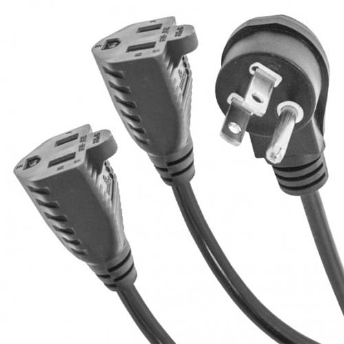 55-788A-RT | Right Angle 3 Prong Male Plug (45 Degrees AC Pins) to 2 x 3 Prong Female Jack AC Extension Cable, 18 Awg 8 in. Long. UL Listed.